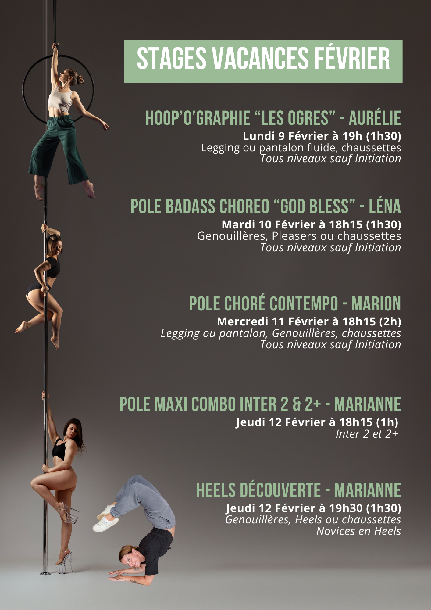 Il y a du challenge dans l’air ! Marianne vous a concocté un combo XXL en spin pour revoir les figures et les inversions clés de votre niveau avec plein de nouvelles variations. L’objectif de ces stages est de vous permettre d’acquérir une technique impeccable sur les figures et les transitions. Et bien sûr beaucoup de fun à la barre !