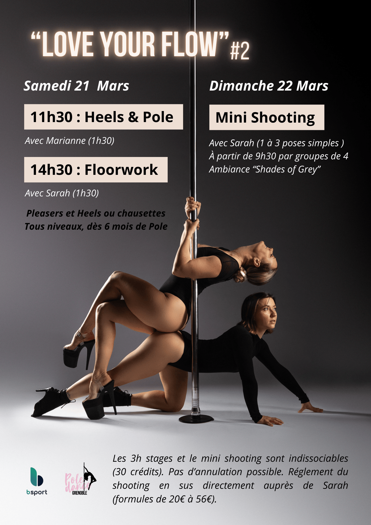 Dress code : pleasers (talons “plateformes” spécifiques pour la pole, pas de talons de ville) ou chaussettes, genouillères.